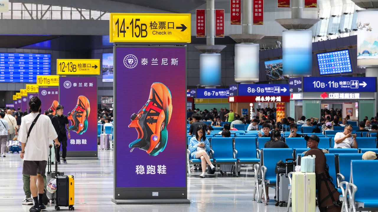 兆讯锁定客流最为密集的核心候车区,科学布局旅客乘车必经之路,利用高清矩阵式媒体形成统御全场的核心视觉,为泰兰尼斯构建品牌专属沉浸空间,促进泰兰尼斯与消费者之间高频次、近距离的互动,筑牢“运动防护跑鞋开创者”的品牌认知,助推泰兰尼斯完成从“中国制造”到“中国品牌”价值跃升。